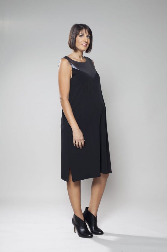 השמלה עשוייה מבד לייקרה המאפשר גדילה נעימה לתוך השמלה בכל שלבי ההריון בשילוב דמוי עור בחלק העליון